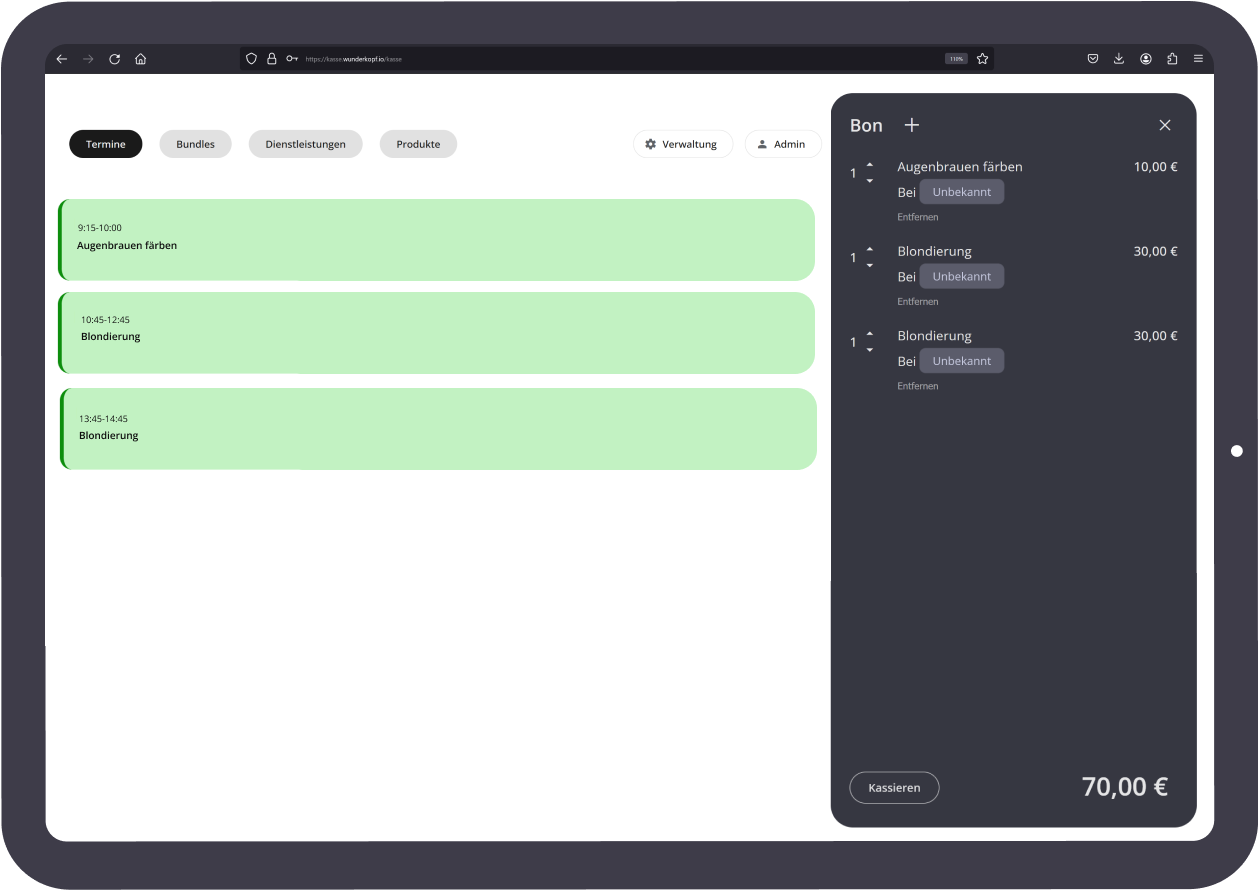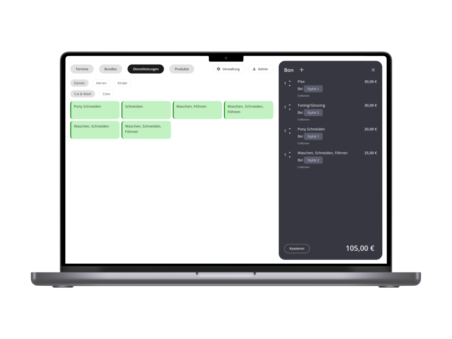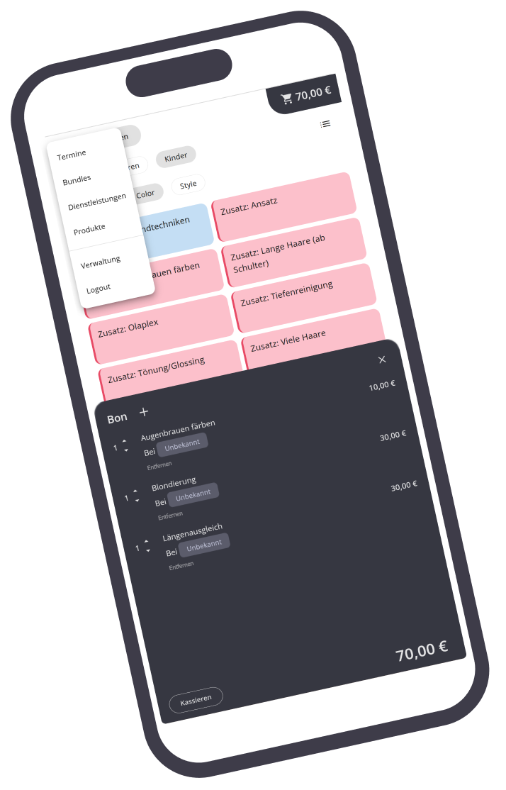 Alle Preise, alle Produkte und alle Termine direkt in deiner Kasse. Kassiere mit einem Klick, einfacher geht es nicht